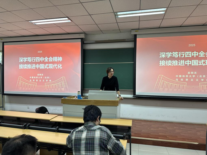 学习活动围绕学习贯彻党的二十届四中全会精神及中共中央关于制定国民经济和社会发展第十五个五年规划的建议展开。会上,孟翊洁老师以“深学笃行四中全会精神,接续推进中国式现代化”为主题,结合权威发布与课堂案例,系统解读了我国在“十五五”时期的发展环境与战略方位,梳理“四大支柱”与“六个坚持”等关键要点,强调要在党的全面领导下,坚持以人民为中心,完整、准确、全面贯彻新发展理念,统筹发展和安全,推动高质量发展。